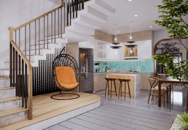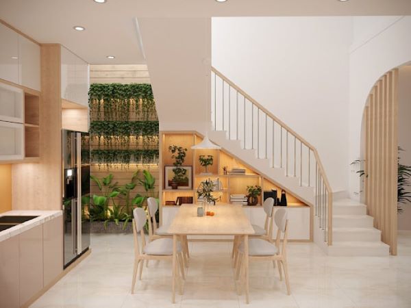 Kết hợp tủ gầm cầu thang tận dụng diện tích để đồ, kèm thêm chi tiết cây xanh tạo cảm giác gần gũi tự nhiên, giúp phòng bếp không bị bí bách do không gian hẹp.